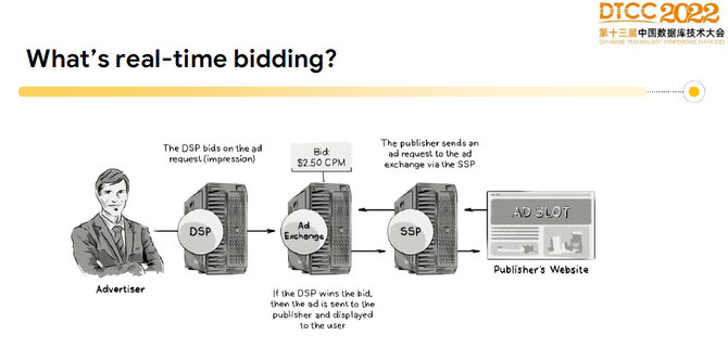 在数字广告方面有实时竞价系统,以上图为例,最左边Advertiser是广告主,他会借助DSP来投放平台,最右侧是Publisher,他会通过SSP告诉广告交换平台,我这边有很多流量,可以告知广告主投放。