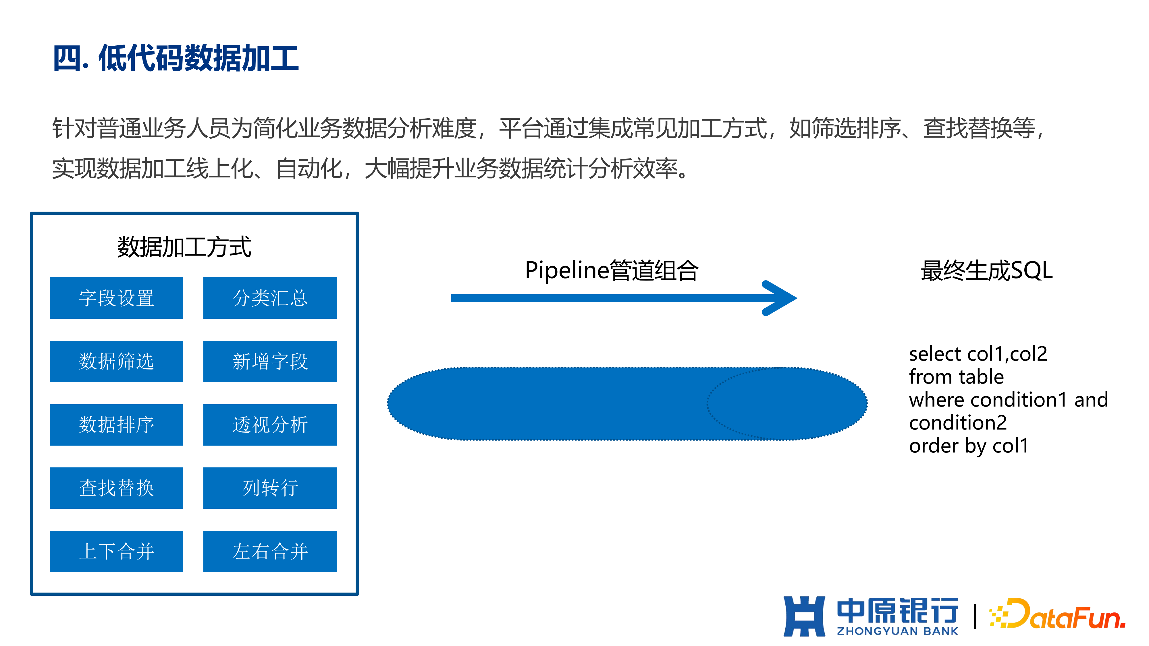 2020 年,针对业务人员提升数据统计的效率。开始建设智能拼表,低代码加工和可视化分析工具,可以让业务人员在无需借助比如 SQL 加工的方式下可以完成数据的加工。这里补充一下,智能拼表是结合中原银行的业务特点,允许业务通过低代码的方式进行报表拼接。