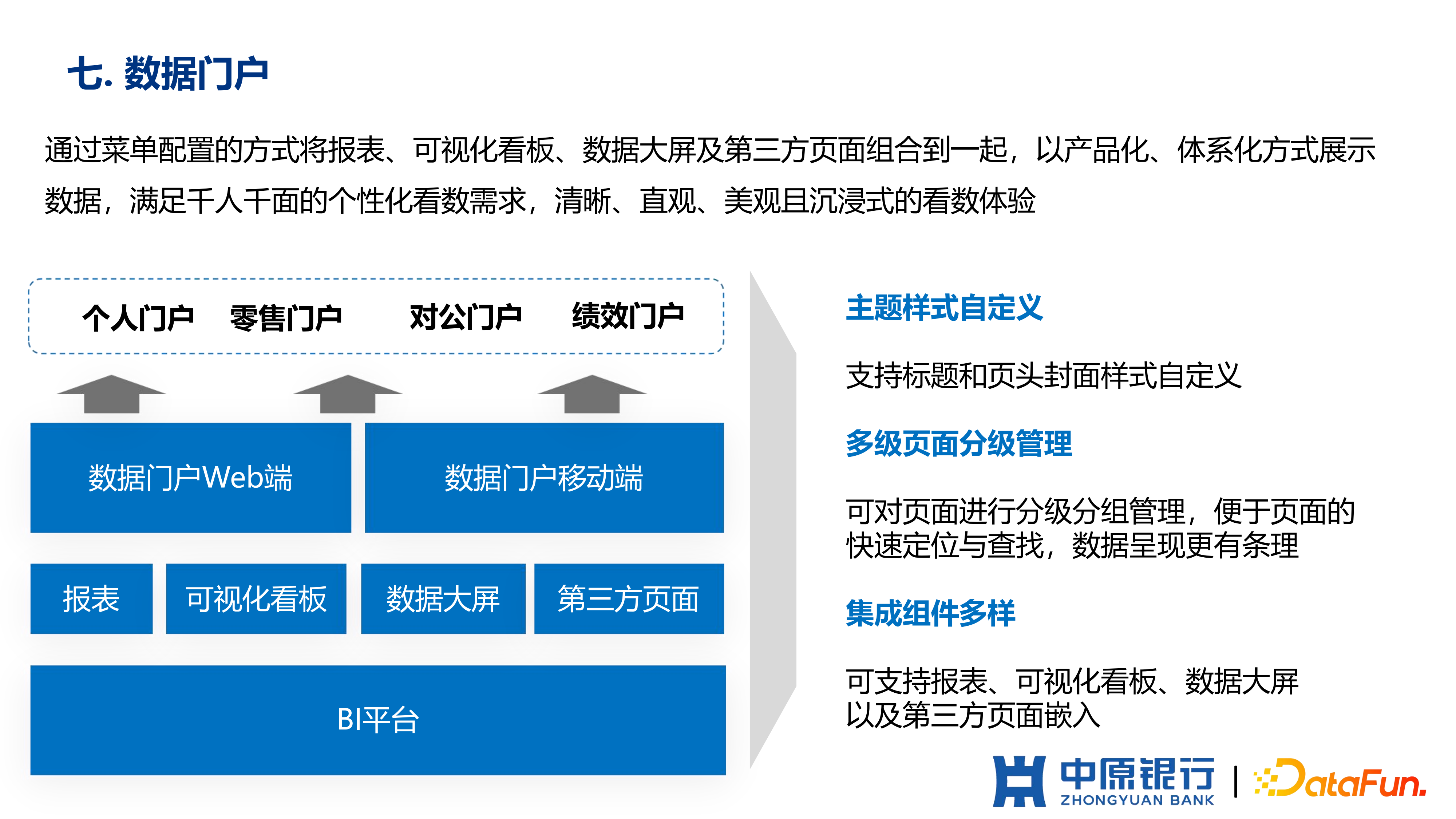 (7)个性化门户。是为了统一数据出口,把报表可视化看板以及大屏统一输出在一个门户中,供业务人员日常查询使用。