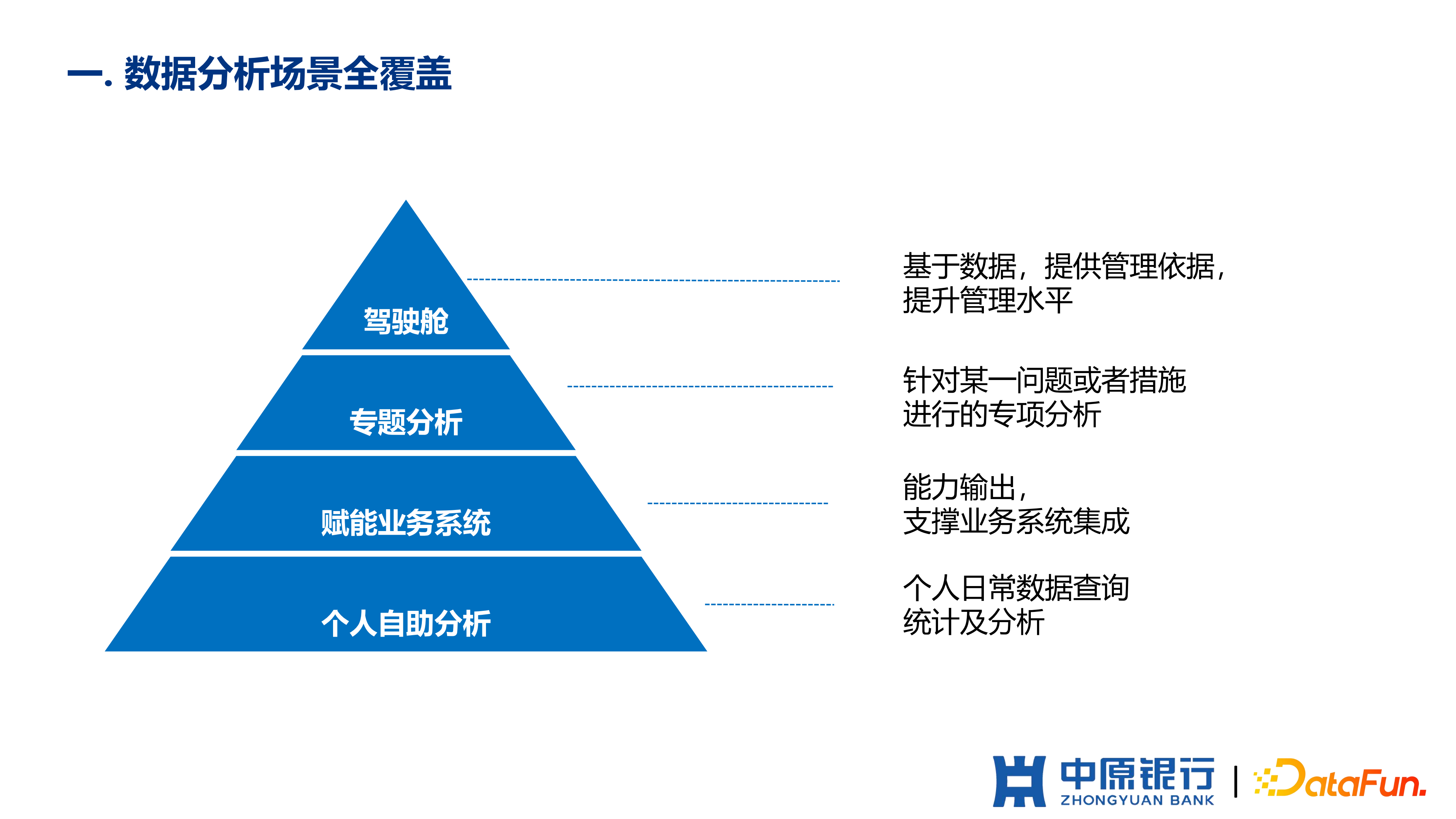 不同的企业对于 BI 是有不同的诉求的。中原银行对 BI 的诉求,是满足行内不同人群对数据查询、分析和探索的需求,从而为管理和业务提供数据依赖和决策支撑。