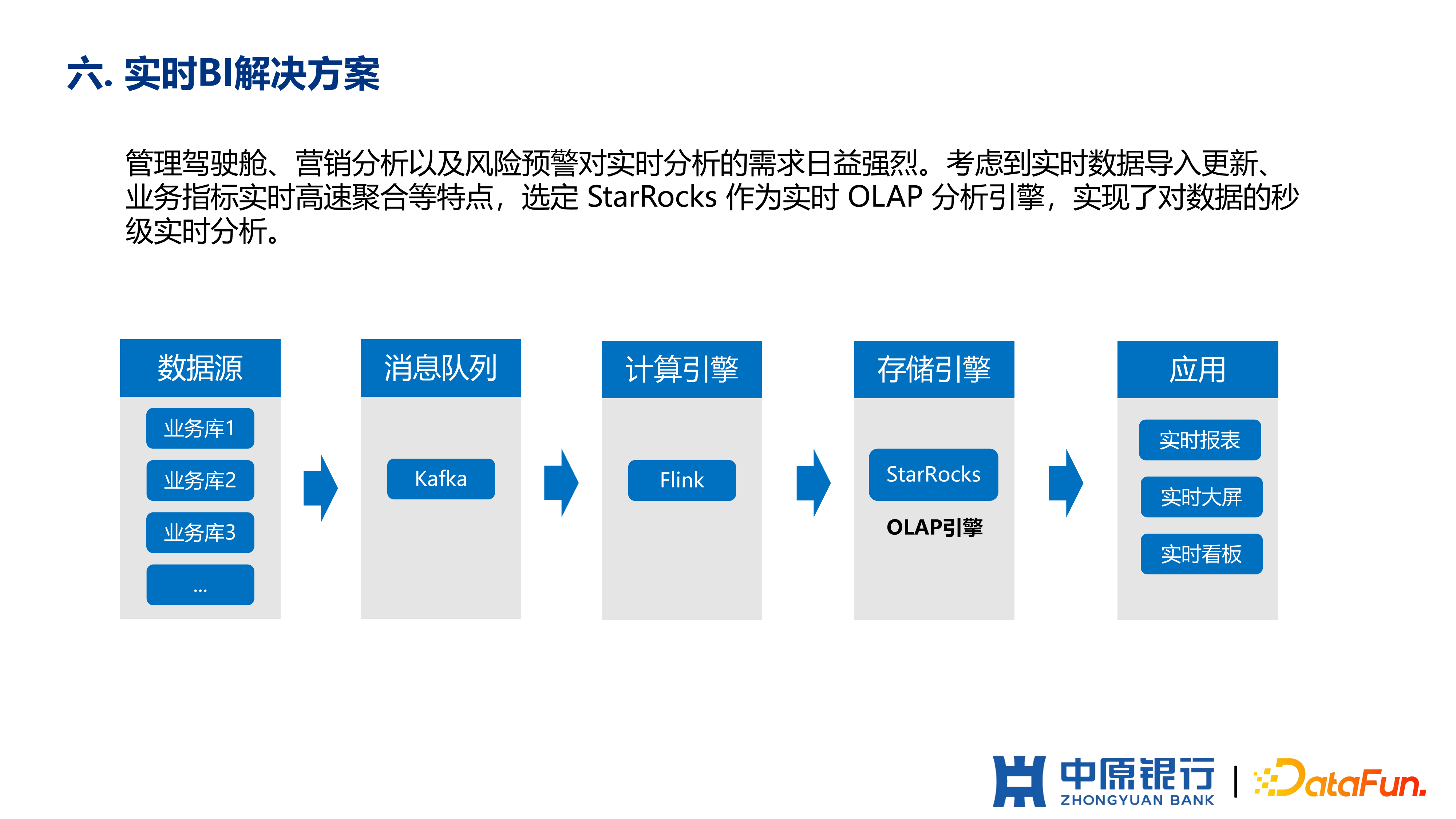 它是有对应的业务需求的,比如我们的管理驾驶舱,营销效果分析以及风险预警等等,这些对实时数据是有比较强的诉求的。他们之前数据都是 T+1 的数据,这对预警场景来说已经是比较落伍了,T+1 的数据已经对于该场景已经没有什么效果了,所以我们会依据这些场景去构建实时 BI 的解决方案。