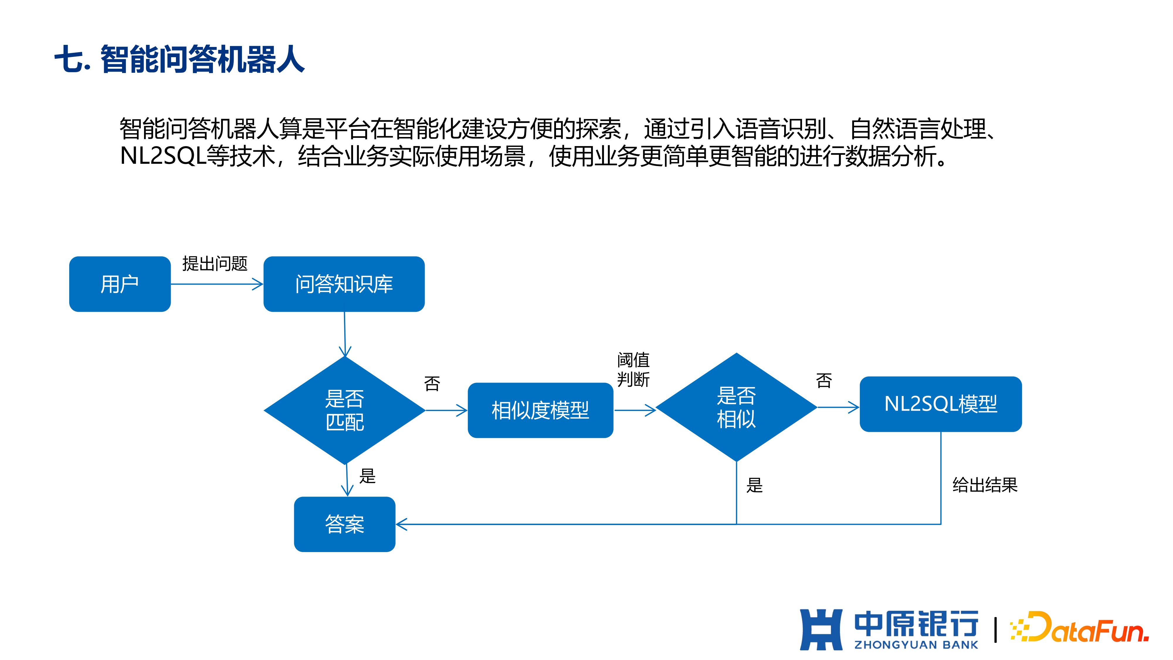 整个流程就是用户在平台上提出问题后,后台在问答知识库进行匹配,如果匹配上的话直接会给出答案,如果没有匹配上就会有经过相似度模型跟其他的问答去进行匹配,看是否是相似的问题,通过阈值判断,如果超过阈值,就认为它们是相似的问题,就可以返回相应的答案,如果没有,会经过 NL2SQL 模型去构建对应的查询 SQL 给出相应的结果。