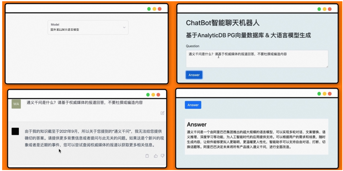 对于前面Demo视频结合大语言模型LLM和ADB-PG进行时事新闻点评解答的例子,让LLM回答“通义千问是什么”。可以看到,如果我们让LLM直接回答,得到的答案没有意义,因为LLM的训练数据集里并不包含相关的内容。而当我们使用向量数据库作为本地知识存储,让LLM自动提取相关的知识之后,其正确地回答了“通义千问是什么”。