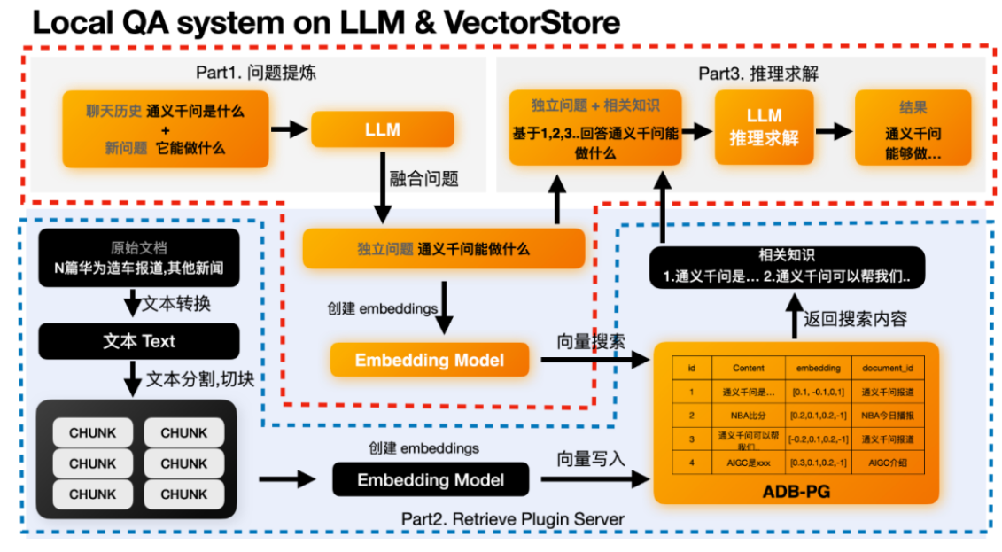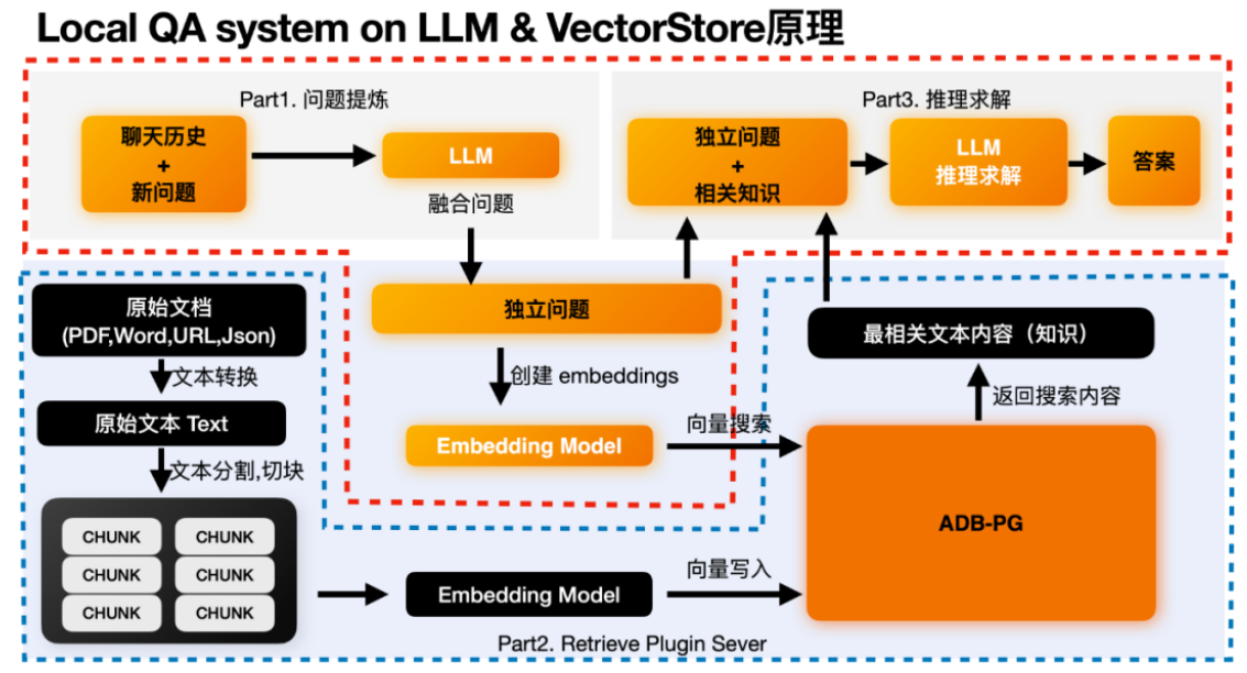 本地知识问答系统(Local QA System)主要是通过结合了大语言模型的推理能力和向量数据库的存储和检索能力。来实现通过向量检索到最相关的语义片段,然后让大语言模型结合相关片段上下文来进行正确的推理得到结论。在这个过程中主要有两个流程: