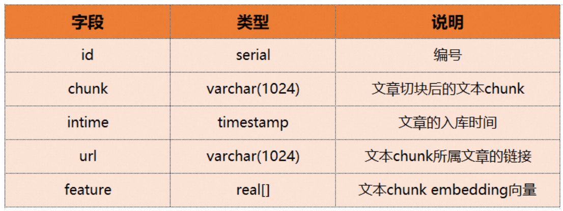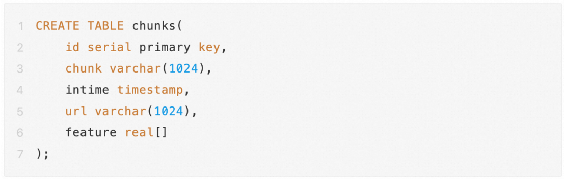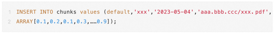 下面我们用一个具体的例子来说明ADB-PG的向量检索和融合检索如何使用。假设有一个文本知识库,它是将一批文章分割成chunk再转换为embedding向量后入库的,其中chunks表包含以下字段: