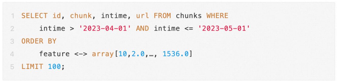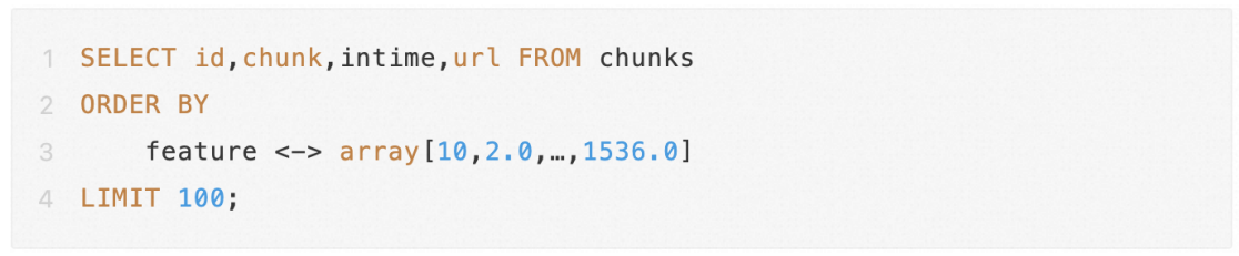 在这个例子中,如果我们要通过文本搜索它的来源文章,那么我们就可以直接通过向量检索进行查找,具体SQL如下: