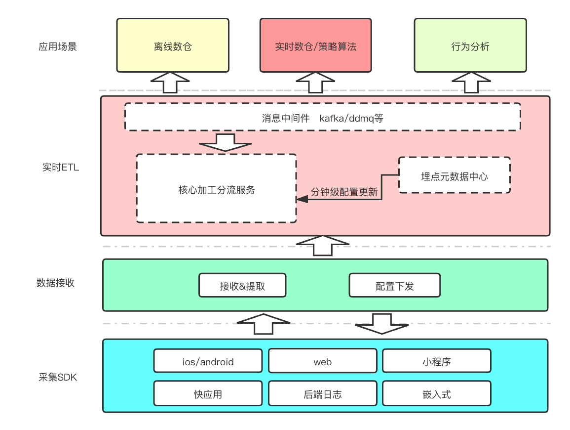 采集SDK:用于收集、组装、发送埋点数据,通过相关缓存策略,降低丢包率、重复率。同时接收服务端策略下发,定向采集。