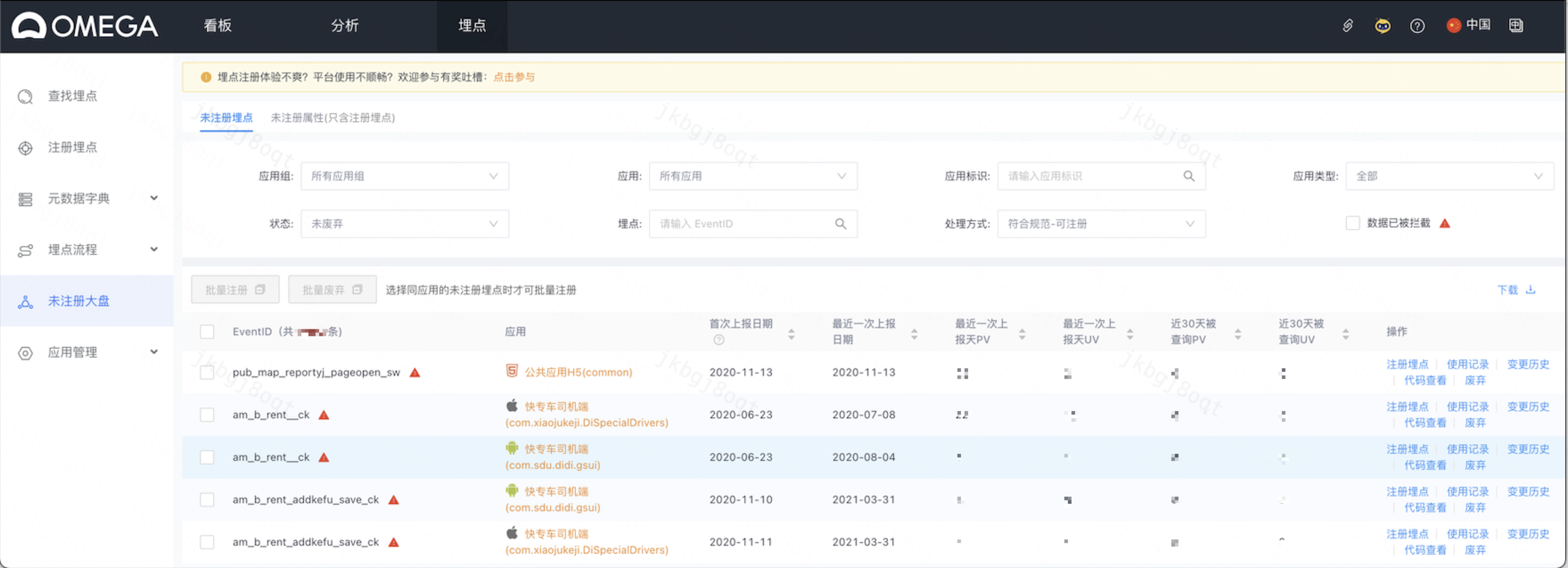 针对已经在端上进行上报,但是未在埋点管理平台注册的埋点,或者已注册埋点但未注册属性的情况,提供查看及注册使用,方便流量链路相关同学进行埋点治理。