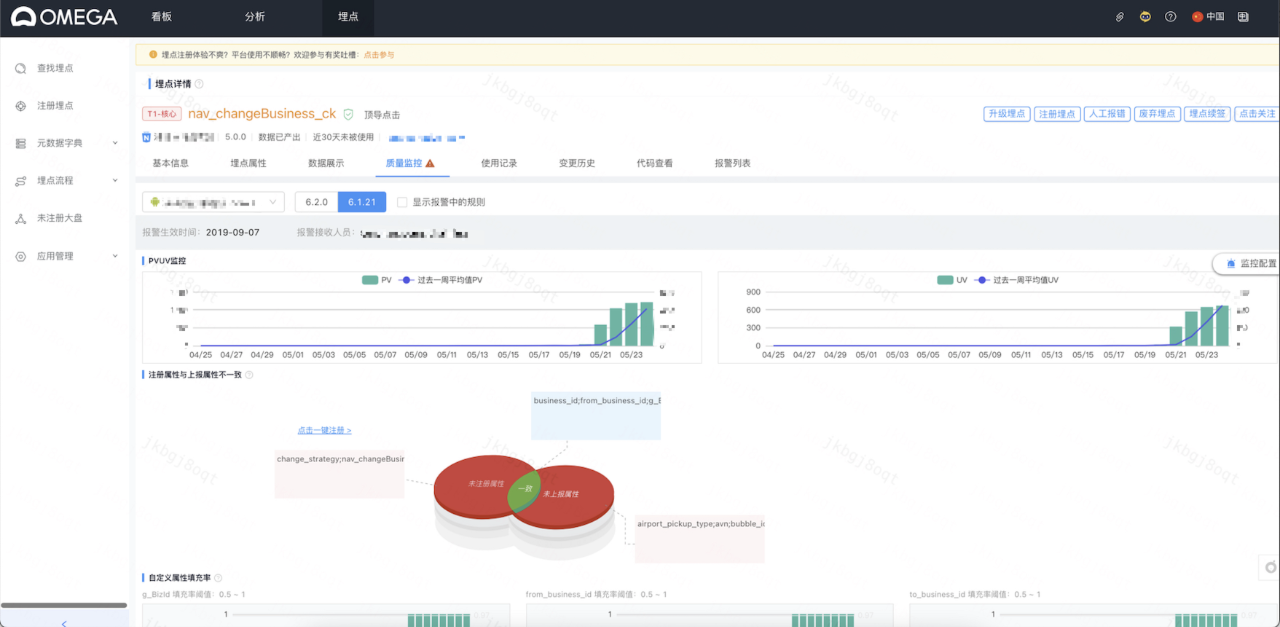 除了业务自定义信息外,埋点也会包含较多通用属性,如uid、城市id、渠道等信息,平台会提供系统属性填充率、Android/IOS比值、枚举值等监控能力,用户也可以在平台进行自定义配置。