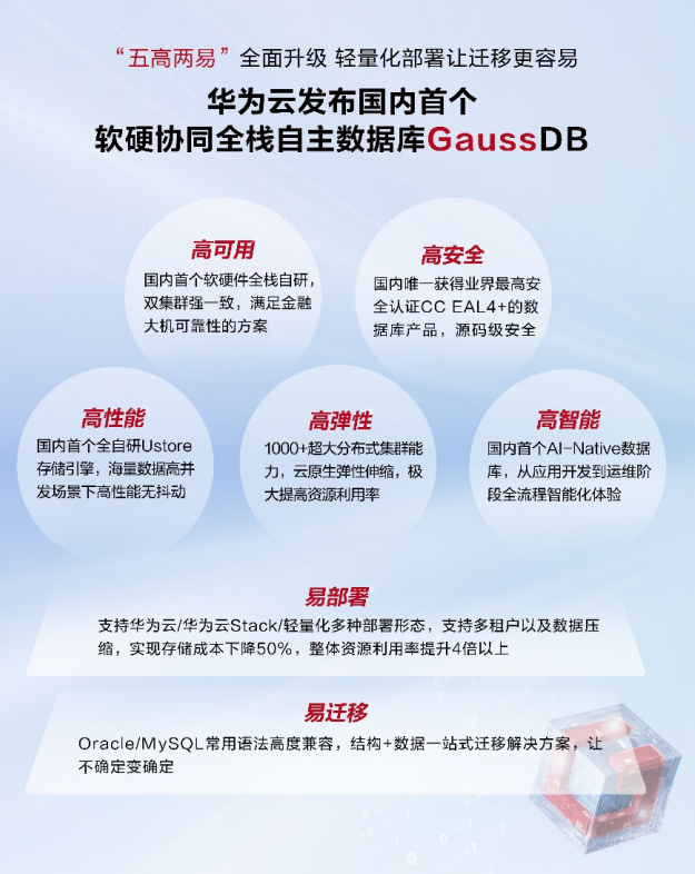 作为新一代分布式云数据库,GaussDB通过多维度的技术创新,在行业实践中构筑了高可用、高安全、高性能、高弹性、高智能的技术优势,而在数据库替换场景中,又具备易部署、易迁移的特性。