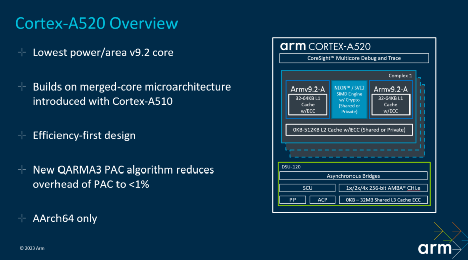 基于两年前推出的Cortex-A510合并核心(merged-core)架构,及重点围绕数据预取和分支预测进行的新微构架级的调整,Arm大幅提高了新一代产品的能效。Cortex-A520秉承“效率至上”的设计理念,且其性能也比Cortex-A510提升了8%。
