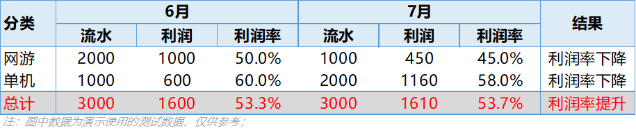 整体与局部的效果差异的问题,如何解读?比如引言中网游单机利润率下降但整体利润率提升的问题。