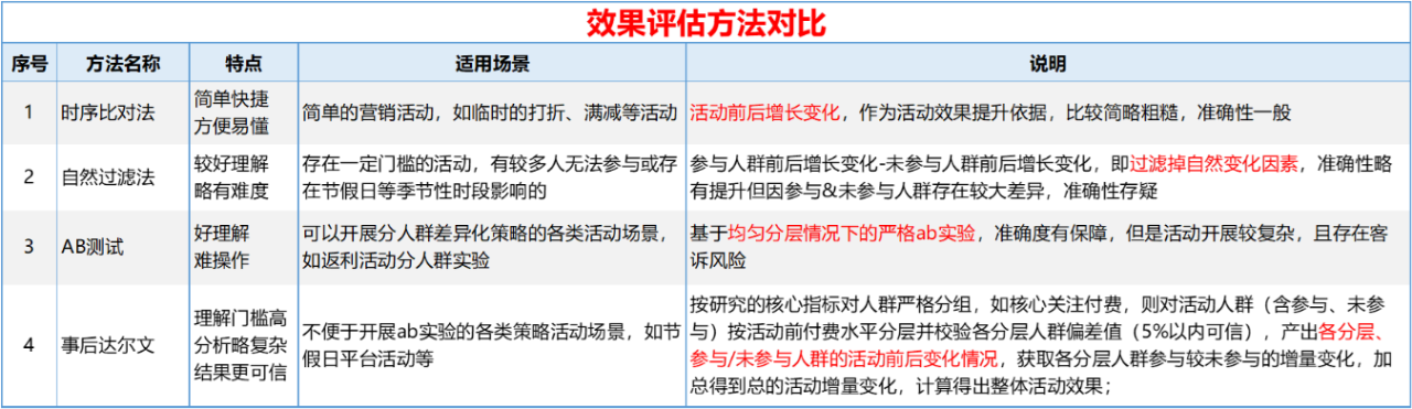 判断业务效果,我们通常会细分很多指标,比如参与率、投入产出比、流水、利润等。但我们最关心的往往是指标增量,这是一个相对概念,核心就在于如何对比。为此,行业内通用的分析方法有如下几种: