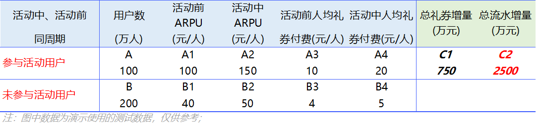 受节假日等季节因素影响,本周和上周会有自然变化因素,为了过滤自然因素影响,我们将活动参与人群与未参与人群拆解开,将自然时间变化计算为未参与人群的本周流水比对上周流水的数值,最终按活动增量减去自然变化情况来作为最终增量;