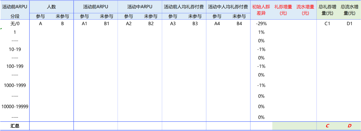 集合方法2、3的各自优势,我们将参与活动人群/未参与人群,基于均匀分层的逻辑,按上周末arpu等指标拆解分层,保障对比对象的相对公平,计算各分层内参与人群的增长-自然增长(同分层未参与人群的增长),最终汇总整体结果。