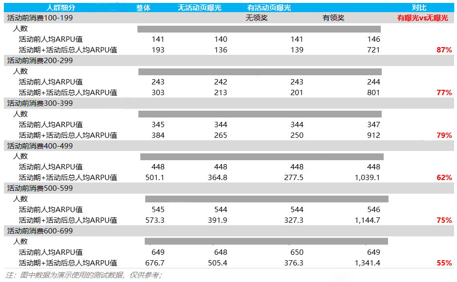 有曝光用户内部对比:有活动曝光但无领奖用户本身为游戏的低付费意愿用户,因此后向付费甚至不及无曝光用户,而活动对参与的用户有明显的付费刺激作用。