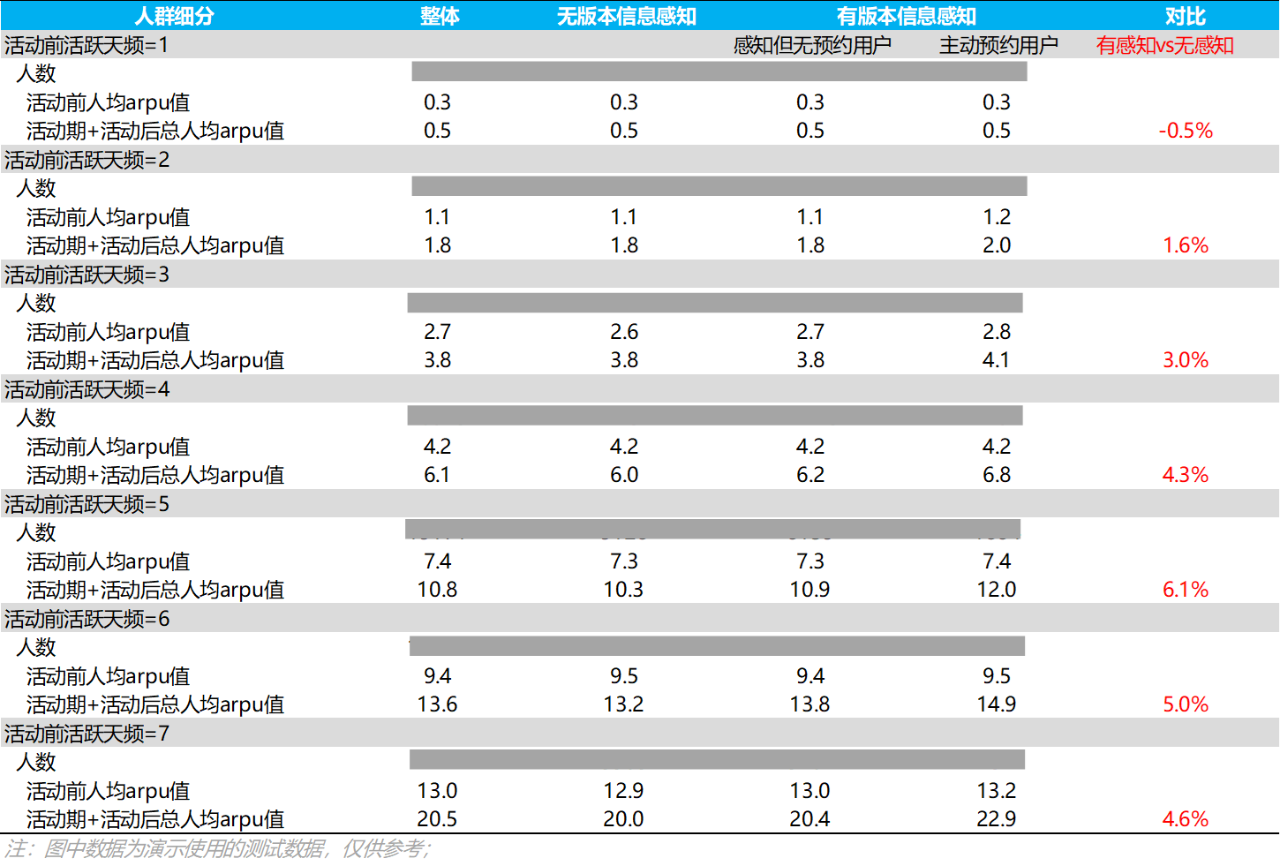 版本信息感知价值:提前感知版本信息的用户在版本更新后向付费有提升,总体付费约高于无版本预约感知用户6%,且在高活跃天频下付费与无感知用户拉开差距;