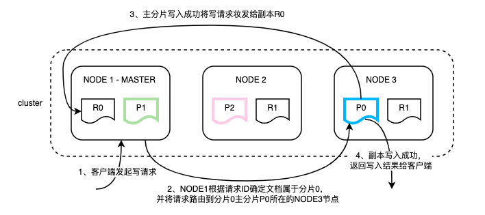 ES写入是先写主分片,主分片写完后再将请求并行转发到副本,副本处理完再由主分片返回写入结果,具体流程如下:(注:本文中Si代表ES具体分片,P代表主分片,R代表副本)