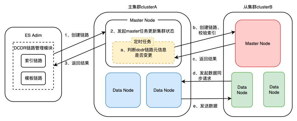ES集群对外提供了DCDR链路创建API,通过API将链路元信息更新到集群状态中,DCDR相关模块通过订阅集群状态变更事件,从而进入数据同步流程。如下图:
