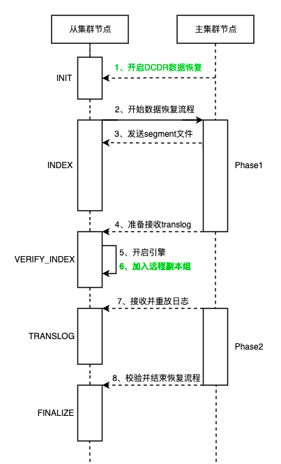 为了保证数据副本的一致性,副本的数据需要恢复到和主分片一致才能正常对外提供服务。ES的副本恢复是分片级别的,分为主分片恢复流程和副分片恢复流程。由于ES的副本恢复流程极为复杂,并且DCDR的数据恢复过程中仅与副分片恢复流程相关,因此这里只简单地介绍下副分片恢复流程。