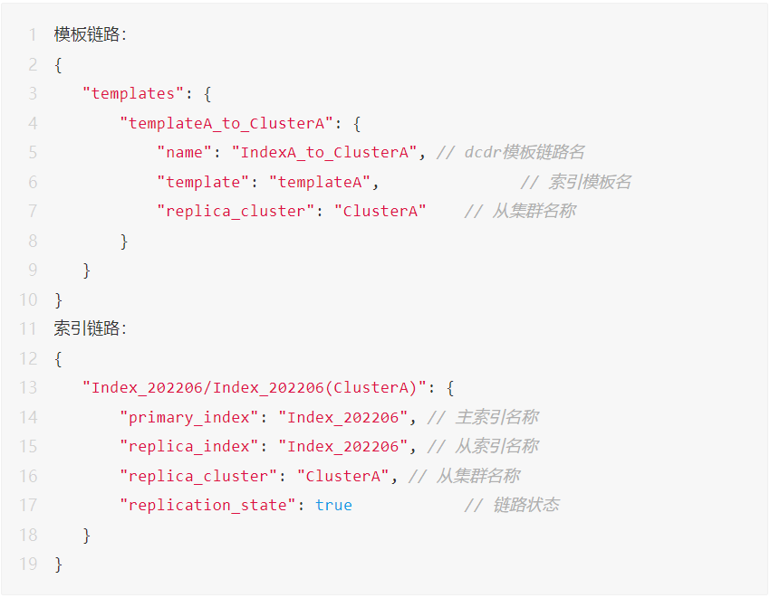 ES集群是基于集群状态驱动的,因此DCDR链路构建的本质就是改变集群状态,并在对应机器上应用新的集群状态。滴滴内部的ES使用方式是索引模板形式(一组拥有相同前缀的索引集合),因此在链路设计上需要支持模板链路和索引链路。DCDR链路集群元信息通过ES cluster state自定义metaData实现,链路拥有统一的命名规则,并且区分模板和索引,主要信息展示如下: