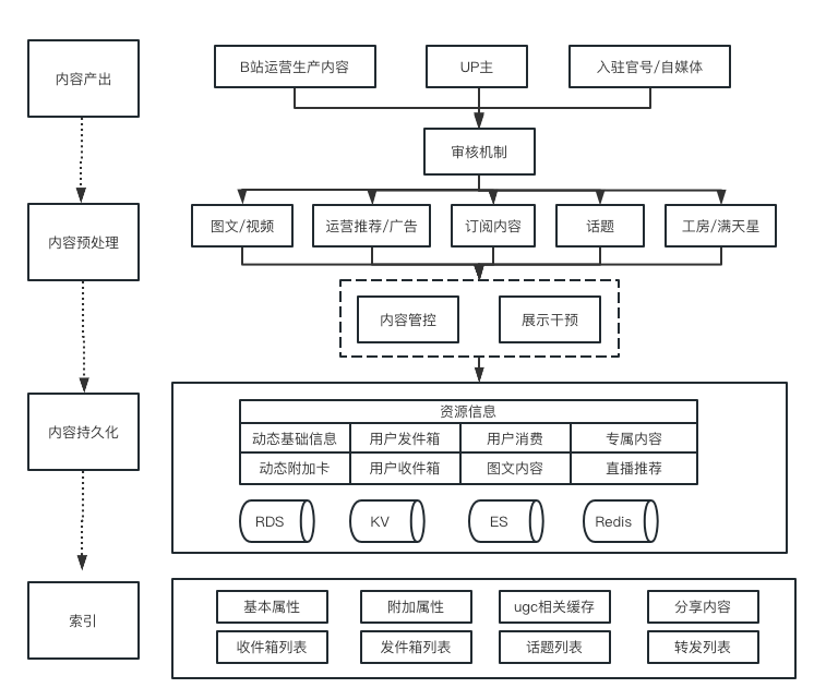 如图2.1所示,总体看,业务范围按照内容生产流程描述,分为4个流程,内容产出、内容预处理、内容持久化、形成索引。覆盖内容收录、编辑、审核、投稿创作端流程,以及投后数据管理、社区氛围管控等流程。