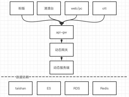 如图2.2所示,该四层架构是现在微服务架构设计中的典型分层架构。动态网关是动态重构时引入的bff层服务,动态负责提供元数据、列表数据、部分内容数据、运营数据等,动态网关负责列表渲染、内容布局、格式控制等,将展示逻辑从原架构抽离,提供统一API适配多端。