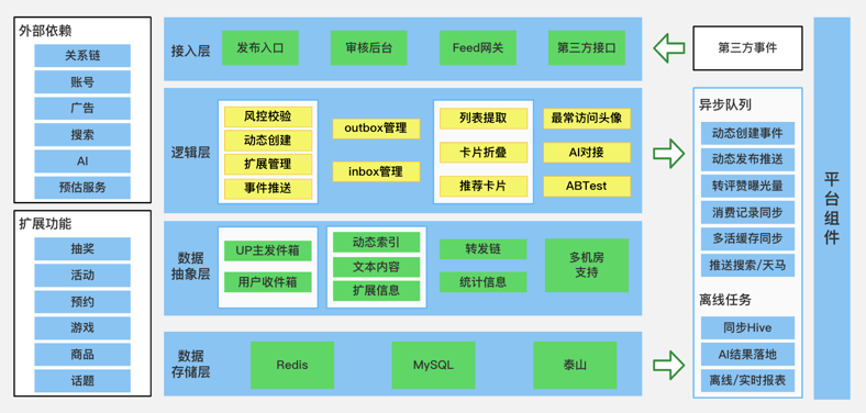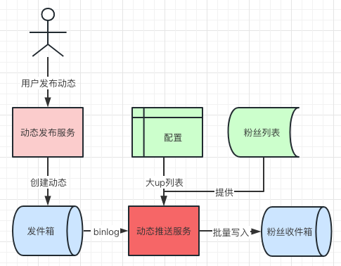 上图展示了关系链补偿模块的流程,红色为调用outbox,绿色为调用inbox。这是为了实现当用户新关注一个小UP,其近期发布的内容并没有加入到inbox,为用户获得更好体验,