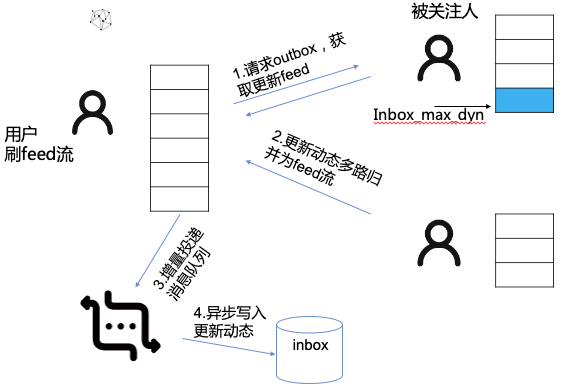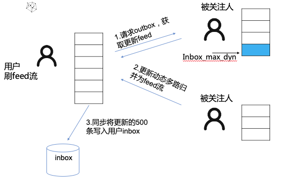 基于这个想法,实现了inbox的最大动态ID作为下限,同步拉取关注列表发件箱的更新,并同步写入inbox,用作快照,下一次拉取则可以避免重复拉取outbox,降低outbox压力。