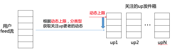 用户根据最大上限向下获取一页动态,根据n个UP的一页,merge成用户的一页。