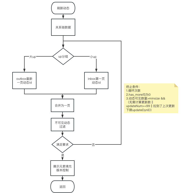 其中,由于每次刷新,要同时返回xx条更新的toast,所以在拉取中,尽量保证一页(20条)为精确的更新,剩余动态ID列表只用于计数。