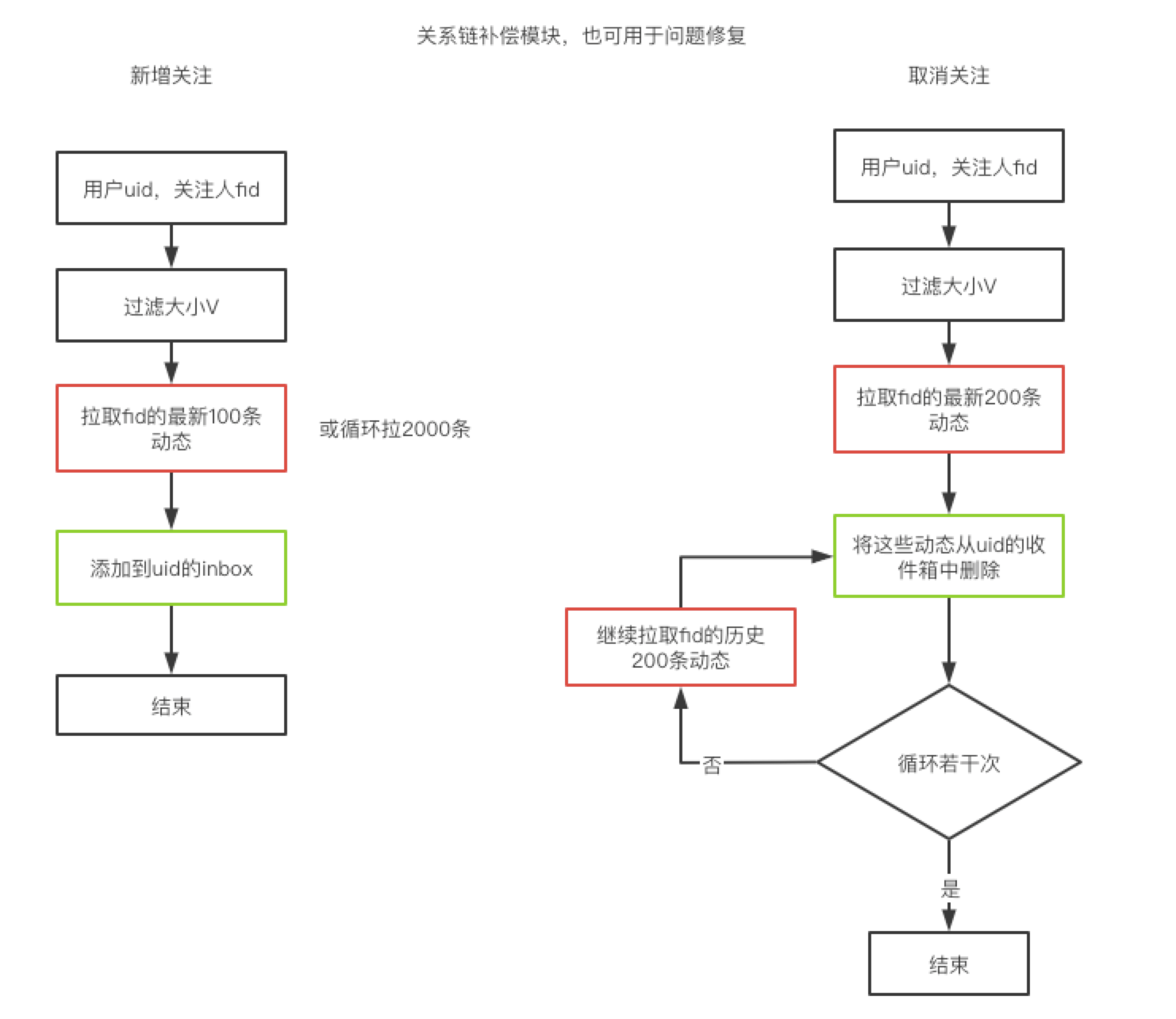 关系链补偿模块:用户关注/取关行为,对inbox的内容做相应改变