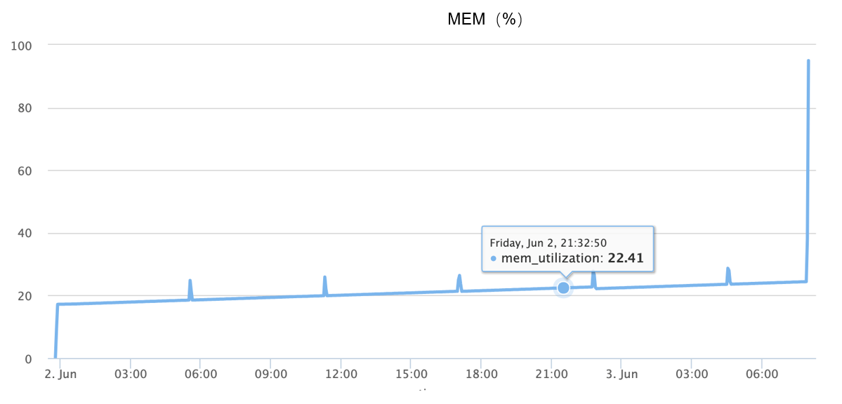 内存在oom的时候以暴涨形式发生,基本上1分半内完成从10%到90%的涨幅,如下图所示: