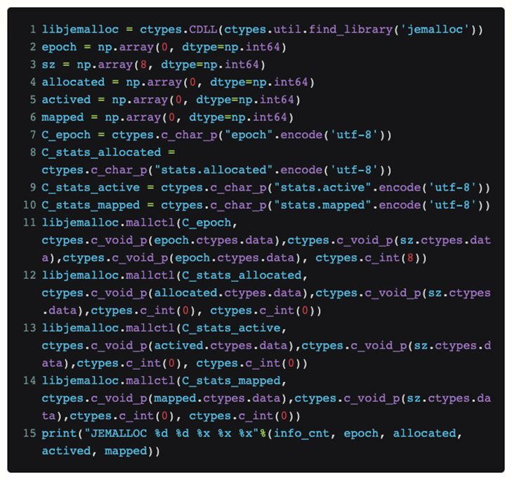 为了不修改torch本身的代码,以及在python中直接查看jemalloc目前的状态,我们使用了ctypes来将jemalloc的接口直接在python中进行暴露: