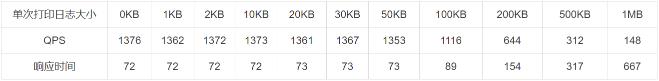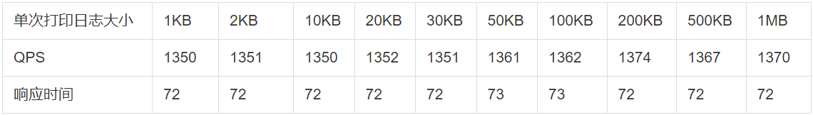 logback异步打印不同大小日志在相同并发数下接口性能数据