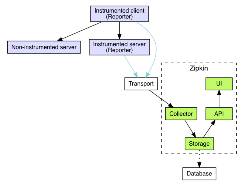 在分布式系统,一次外部请求往往需要内部多个模块,多个中间件,多台机器的相互调用才能完成。在这一系列的调用中,可能有些是串行的,而有些是并行的。在这种情况下,我们如何才能确定这整个请求调用了哪些应用?哪些模块?哪些节点?以及它们的先后顺序和各部分的性能如何呢?链路追踪的目的就是要解决上面所提出的问题,也就是将一次分布式请求还原成调用链路,将一次分布式请求的调用情况集中展示,比如,各个服务节点上的耗时、请求具体到达哪台机器上、每个服务节点的请求状态等等。比如全链路系统之一的zipkin,其架构图如下: