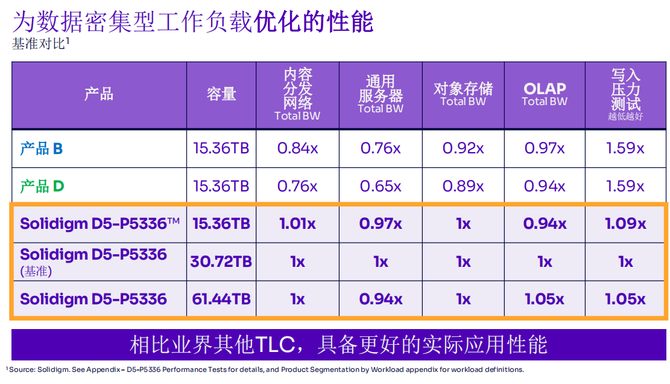 在耐用性方面,Solidigm D5-P5336达到了65 PBW,是其他TLC产品的2.3倍,远远高于其他低成本的TLC产品。在最大容量上,可以做到61.44TB,是其他TLC产品的4倍。我们总体的耐用性远远超过其他低成本TLC产品。