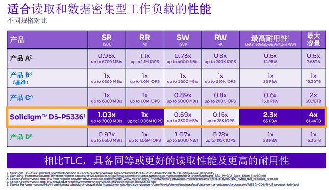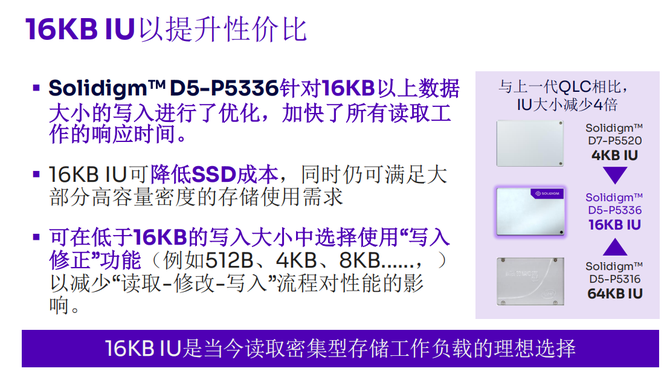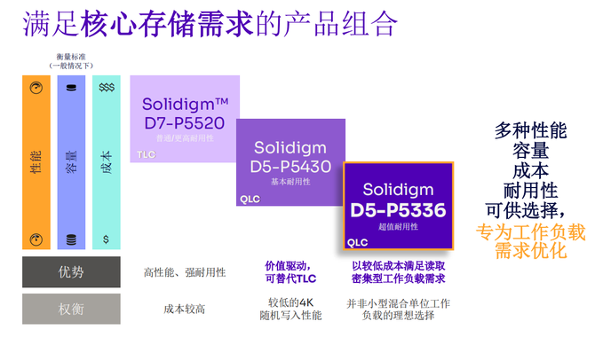 倪锦峰表示,此次Solidigm D5-P5336的发布,填补了以较低成本满足读取密集型工作负载需求的空白。其中Solidigm D5-P5430提供4K的随机写入性能,实现了在一些场景中与TLC无缝切换的。