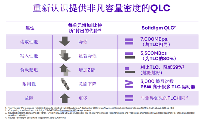 如何以较低成本满足读取密集型工作负载需求,成为Solidigm技术的创新方向。TLC具备高性能、强耐用性,但是成本高昂,因此Solidigm积极推动成本更低的QLC固态硬盘。