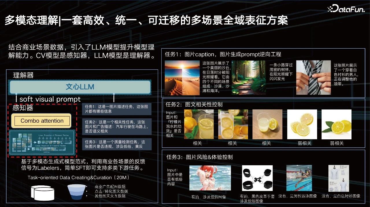 结合商业场景数据,引入了LLM模型提升模型理解能力。CV模型是感知器,LLM模型是理解器。我们的做法就是需要把视觉特征进行相应的迁移,因为刚才提到,表征是多模态的,大模型是基于文本的。我们只需要让它去适配我们的文心LLM的大模型就可以了,所以我们需要利用Combo attention的方式,去做相应的特征融合。我们需要保留大模型的逻辑推理能力,所以尽量不动大模型,只是加入商业场景反馈数据,去促进视觉特征到大模型的融合。我们可以用few shot的方式去支撑下任务。主要任务包括: