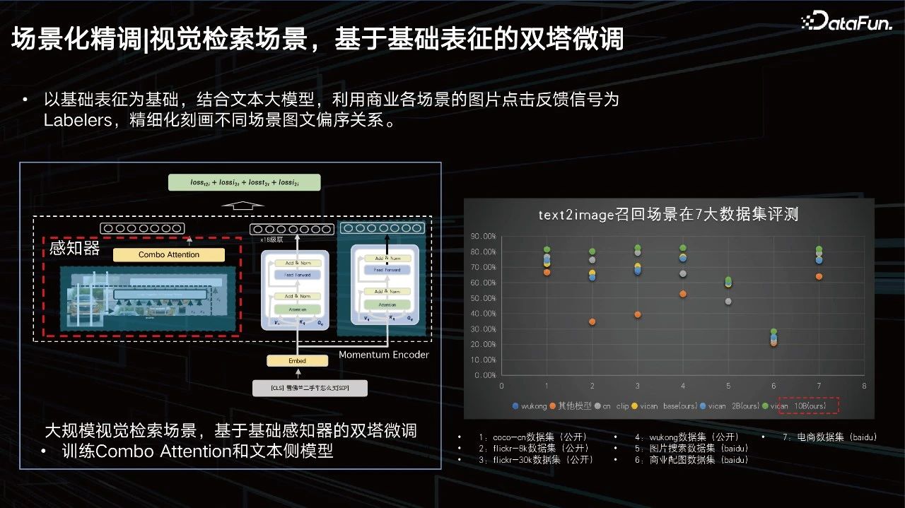 我们构建了VICAN-12B多模态表征+生成模型,利用生成任务让视觉对文本的还原,进一步确保视觉表征对文本的融合效果,提升自然语言对视觉的基础感知能力。上图中展示了模型的整体结构,可以看到它还是一个双塔+单塔的复合结构。因为首先要解决的是一个大规模图片检索的任务。左边的框中的部分我们称之为视觉的感知器,是一个20亿参数规模的ViT结构。右边可以分两层看,下面为了做检索,是一个文本的transformer的堆叠,上面为了做生成。模型分为了三个任务,一个是生成任务,一个是分类任务,一个是图片对比任务,基于这三个不同目标去训练模型,所以达到了比较好的效果,但我们还会进一步去优化。