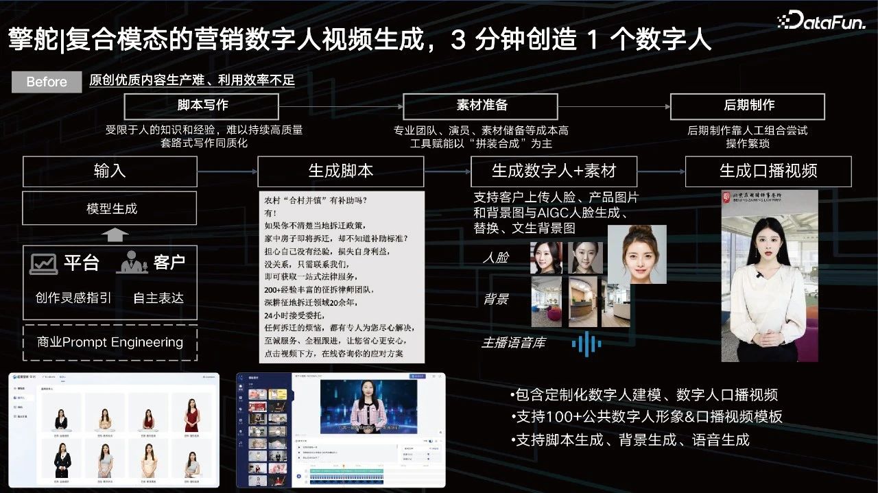 接下来我们可以通过我们的数字人库去召回相应的数字人,但是可能利用AI技术进一步提升数字人的多样性,比如人脸替换、背景替换、口音语音替换去适配我们的prompt,最后脚本、数字人唇形替换、背景替换、人脸替换,视频压制之后,就可以得到一个口播视频。客户得以利用数字人的方式去介绍产品对应的一些营销卖点。这样3分钟即可做好一个数字人,极大地提升了广告主做数字人的能力。