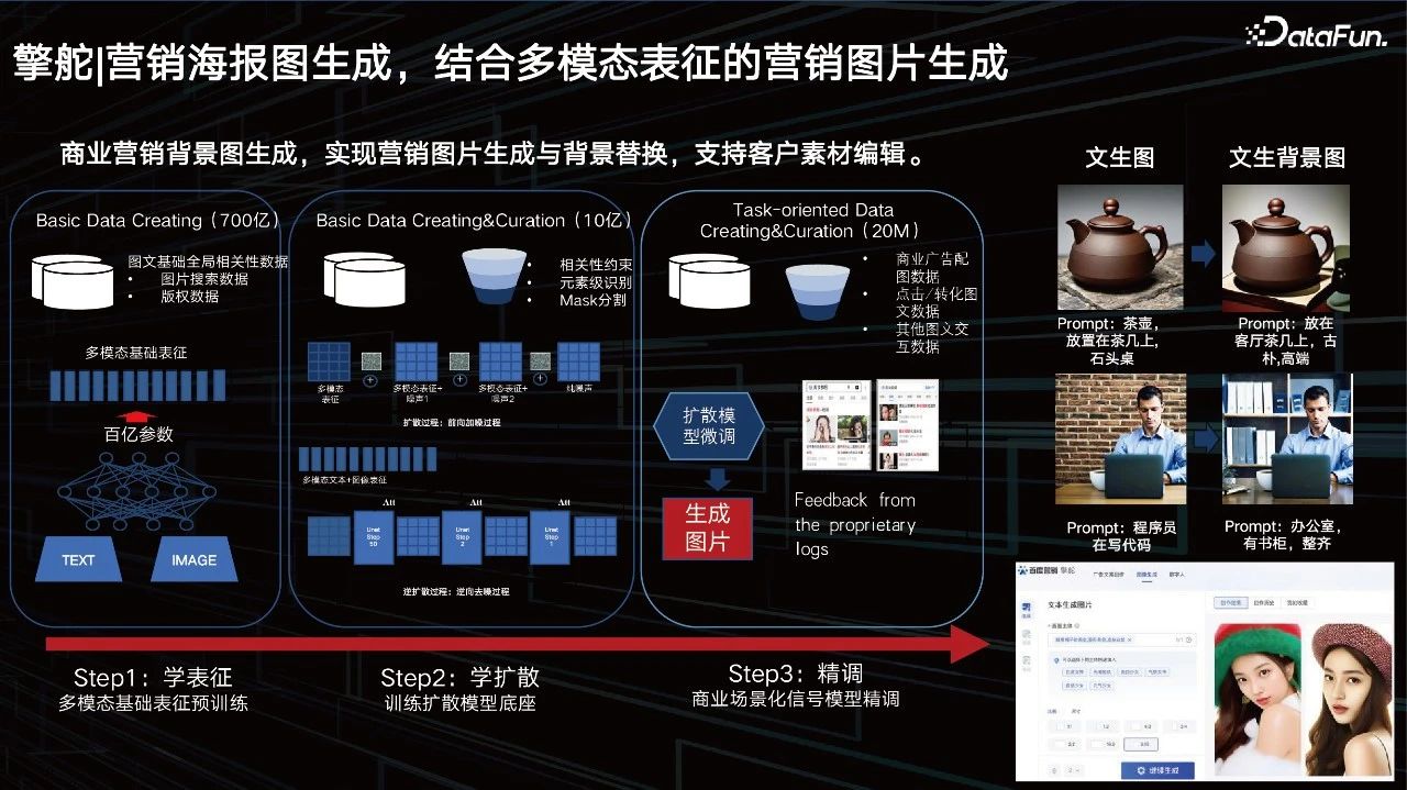 大模型还可以帮助商业实现营销海报的生成和商品背景的替换。我们已有一个百亿规模的多模态表征,中间这一层是我们学的一个扩散,我们基于好的动态表征去学unet。通过大数据的训练之后,客户还希望有一些特别个性化的东西,所以我们还需要加入一些微调的方式。