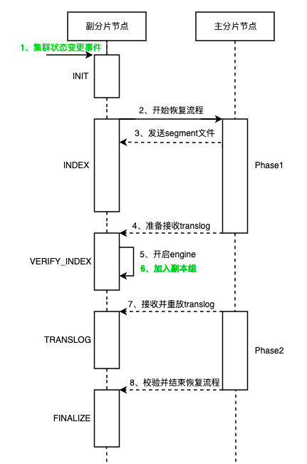 副本recovery的目标是要将本地数据恢复到和主分片一致,主流程分为两个阶段: