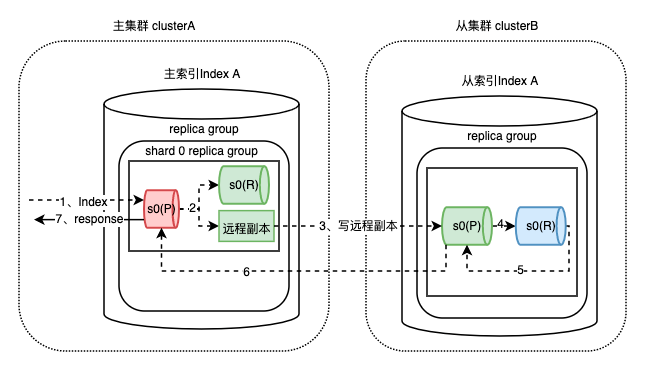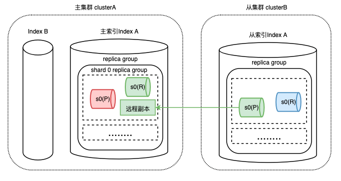 DCDR的核心思想是将从索引对应分片看做主索引对应分片的一个远程副本来处理。如下图,从索引的shard0主分片,会被当做主索引shard0主分片的一个远程副本。