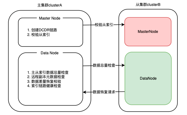 ES集群中,MasterNode负责管控集群元数据,因此在设计校验任务时,主要用于链路元数据创建及检查从索引是否存在;DataNode负责数据存储,因此用于判断主从分片是否需要进行数据恢复。