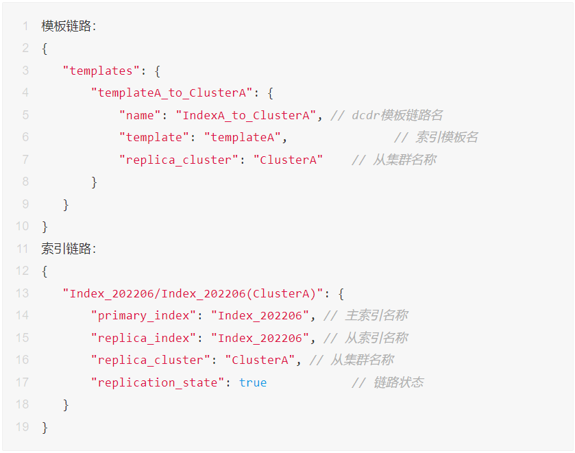 ES集群是基于集群状态驱动的,因此DCDR链路构建的本质就是改变集群状态,并在对应机器上应用新的集群状态。滴滴内部的ES使用方式是索引模板形式(一组拥有相同前缀的索引集合),因此在链路设计上需要支持模板链路和索引链路。DCDR链路集群元信息通过ES cluster state自定义metaData实现,链路拥有统一的命名规则,并且区分模板和索引,主要信息展示如下: