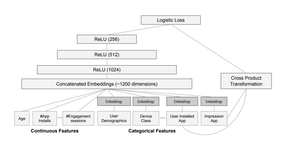 △ctr经典模型 Wide&Deep示意图 (图片来源:Cheng H T, Koc L, Harmsen J, et al. Wide & deep learning for recommender systems[C])