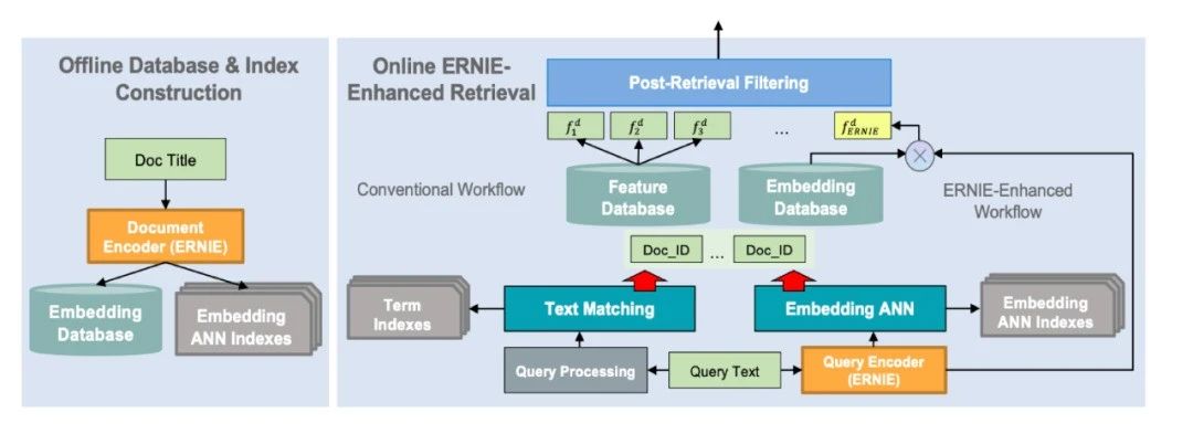 语义检索通路主要包括离线通路(下图左侧)和在线通路(下图右侧)。我们可以看到无论是离线还是在线,都用到了深度学习模型ERNIE。