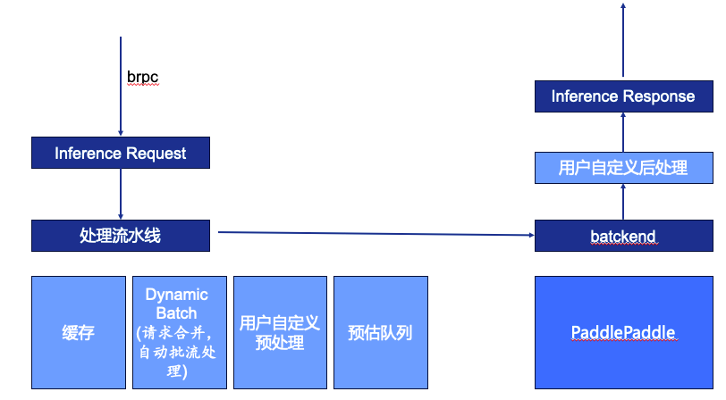 此外,我们还希望整个推理系统的速度足够快,有足够高的吞吐,尽可能降低资源成本。如下图所示,推理系统的请求由brpc输入,brpc是在公司内部各模块间通过网络调用的,可以让用户用类似本地函数的调用方式调用其他服务。系统收到请求后会识别inferfence request里的信息,包括要访问什么模型、访问什么版本、输入了什么等,之后进入处理流水线。